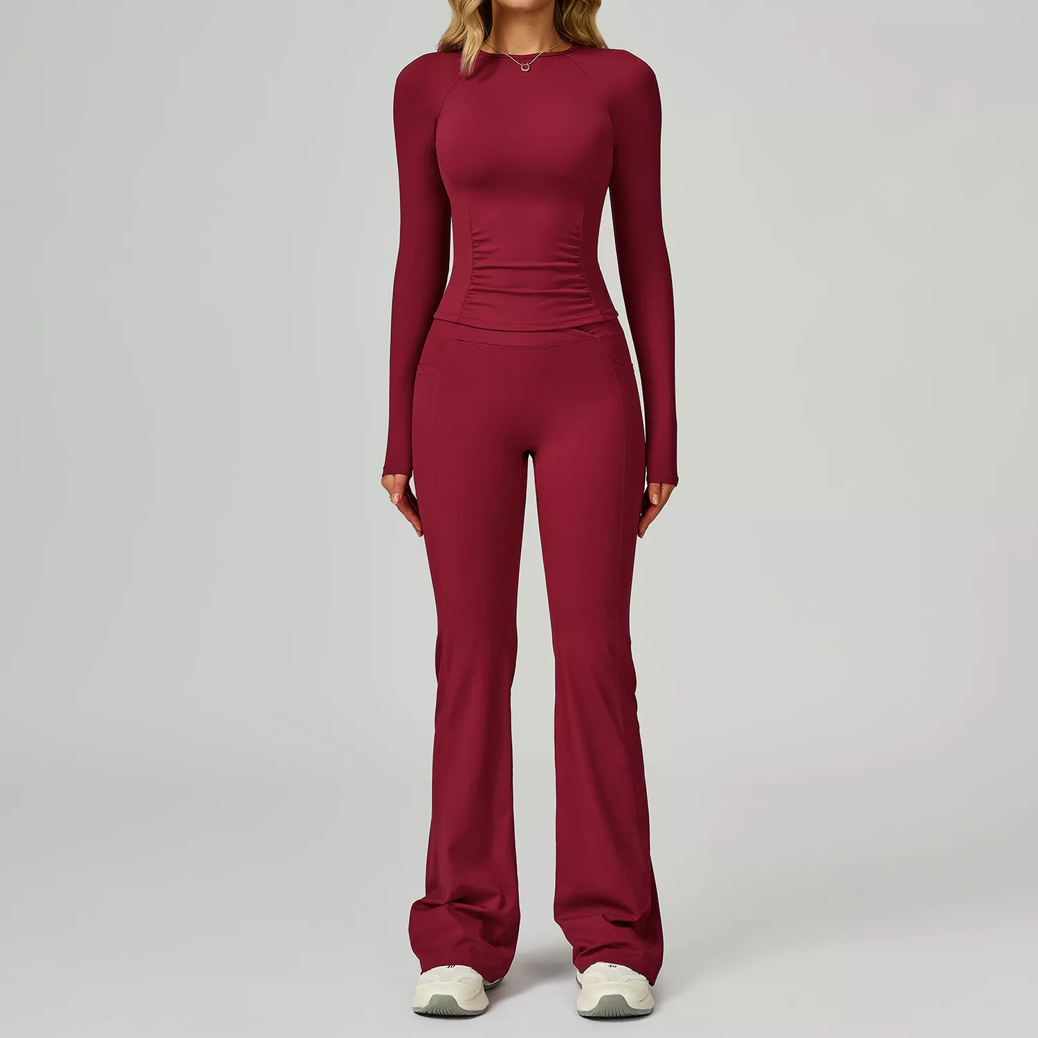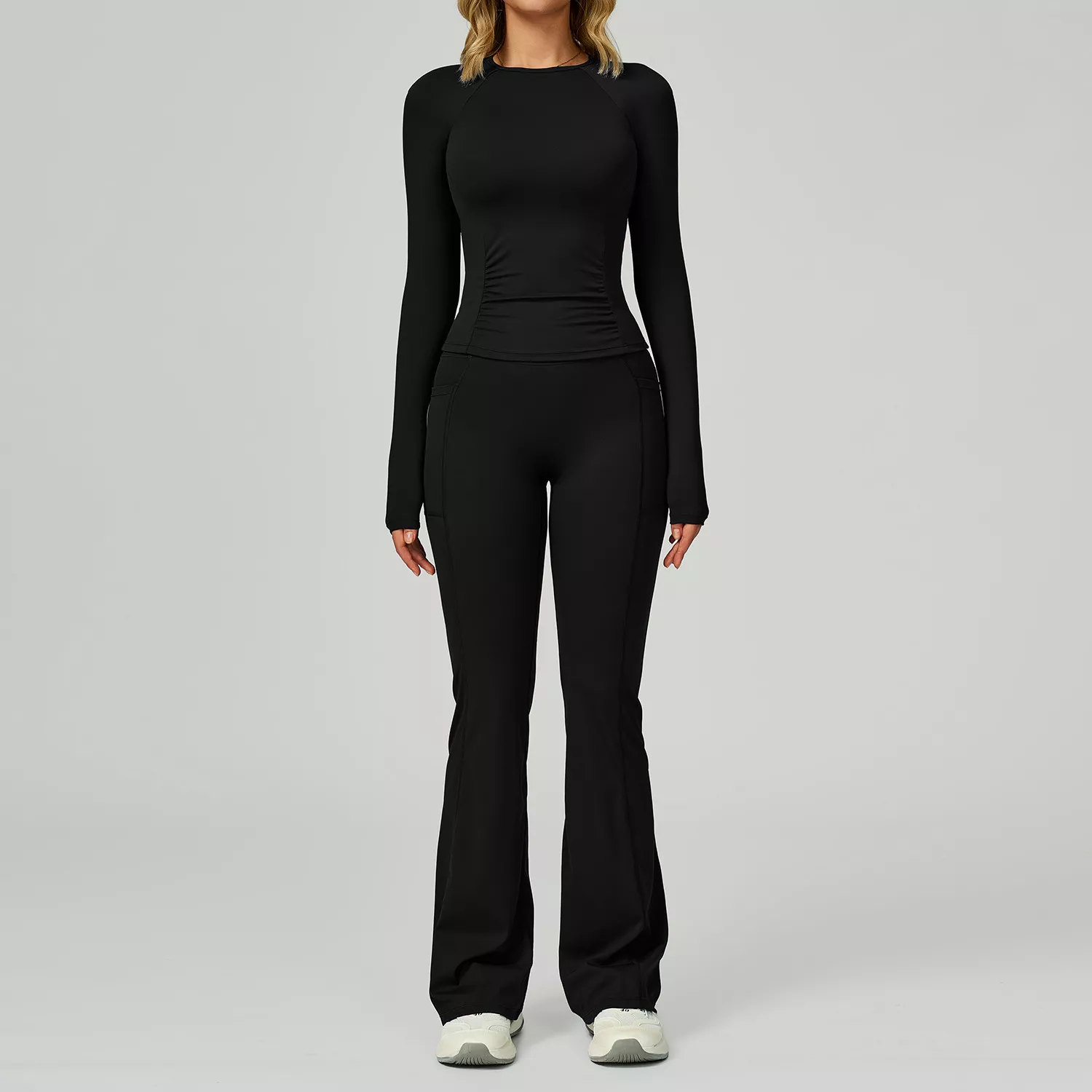 Crafted from premium materials, this workout set provides superior comfort during any physical activity. The high-waisted leggings are designed to hug your curves while offering support and flexibility as you move. The soft fabric allows for breathability, ensuring you stay cool and comfortable whether you are working out or relaxing after a long day. The long sleeve top complements the leggings perfectly, adding a layer of warmth while maintaining a stylish look.