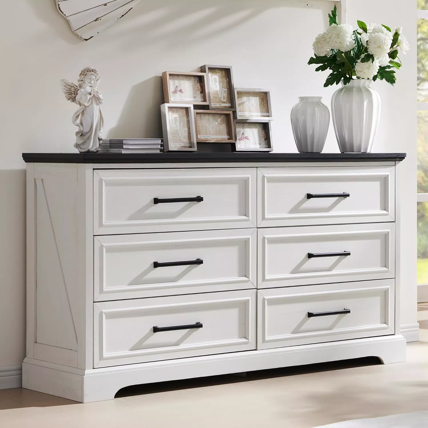 The dresser features six generously sized drawers, perfect for organizing everything from clothes and linens to remote controls and electronics. Whether placed in your bedroom, entryway, or living room, it serves as a functional centerpiece that enhances both storage and style. Its confident presence is grounded in a stable frame with extra reinforcement beneath, and safety is prioritized with an anti-tipping mechanism discreetly integrated on the back panel.