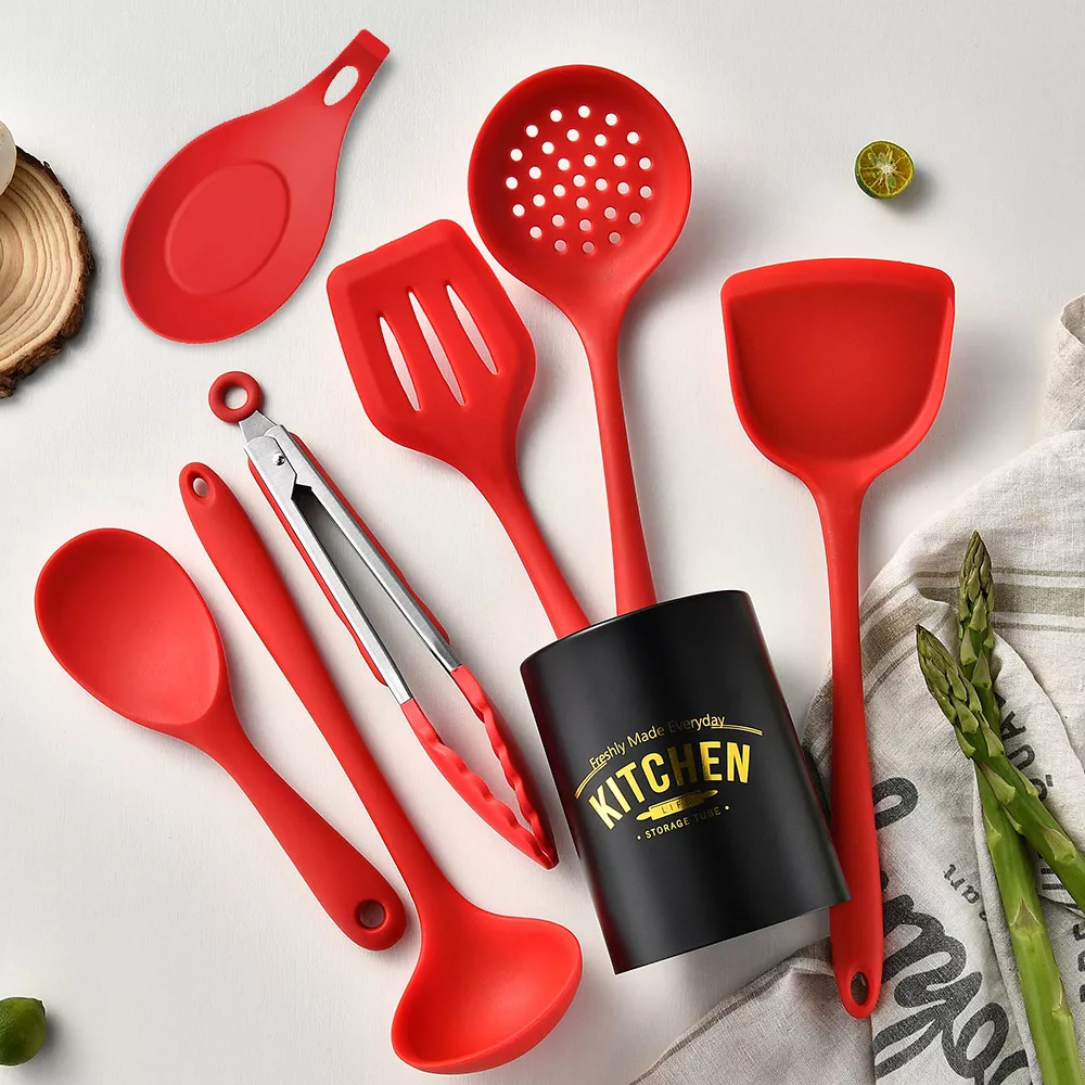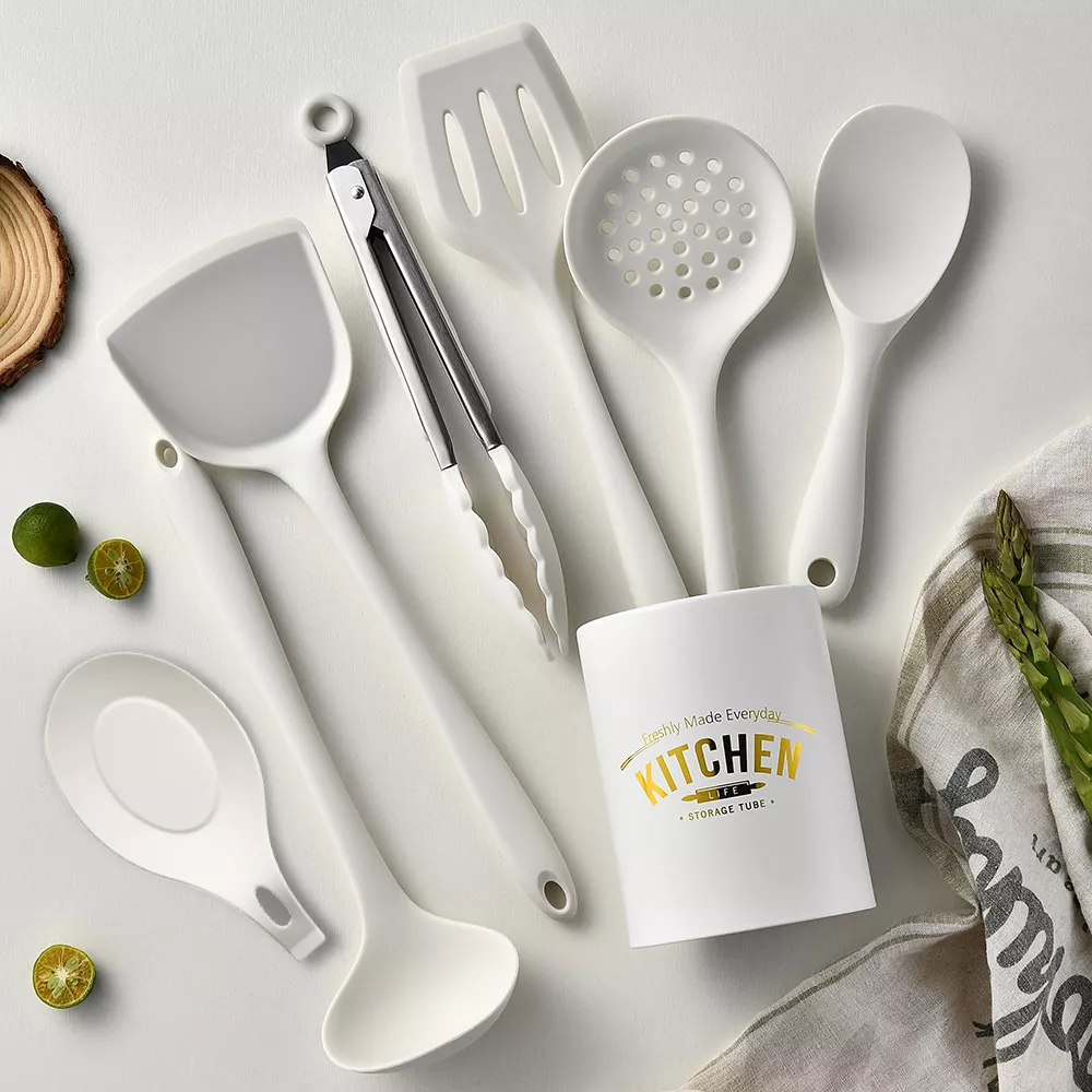 This complete kitchen utensil collection includes everything you need for everyday cooking. Each utensil is crafted from high-quality food-grade silicone that’s heat-resistant, flexible, and gentle on all cookware surfaces. The set includes: