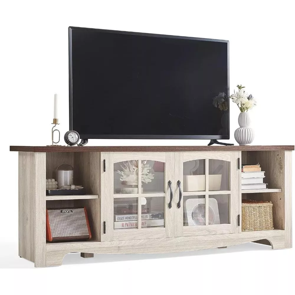 Transform your living room into a cozy, organized retreat with this beautifully designed farmhouse TV stand, made to support TVs up to 65 inches. With its warm washed grey brown finish, elegant glass door accents, and rustic wood grain texture, this entertainment center blends modern functionality with classic charm. Whether you’re binge-watching your favorite series or hosting a movie night, this piece provides the perfect centerpiece for your entertainment setup.