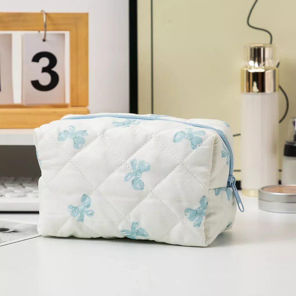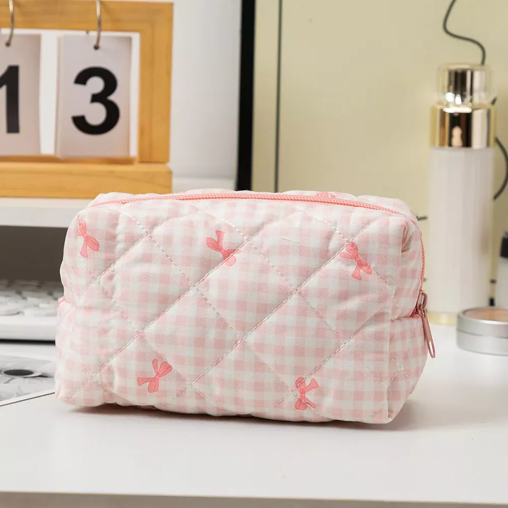 Crafted from soft, durable cotton, this portable wash bag offers a box-shaped structure that maintains its form while providing ample space for your makeup, skincare, and travel essentials. The timeless plaid pattern paired with a delicate floral bow adds a touch of sophistication, making it more than just a storage item—it’s a statement accessory.