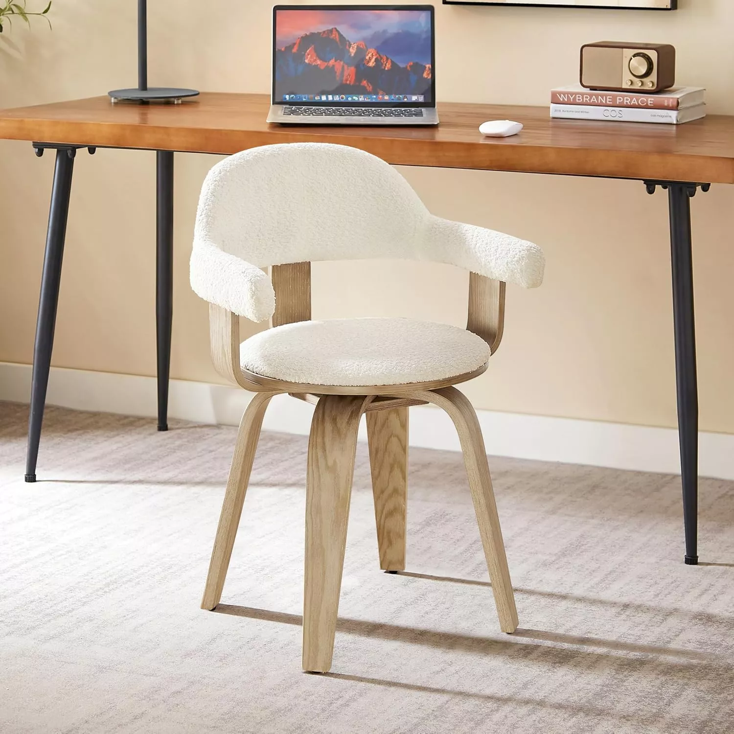 This no-wheel swivel desk chair is best used in environments where comfort and aesthetics are equally important—home offices, cozy reading nooks, dining areas, or as an accent chair in the living room. The open back design offers breathability, while the X-shape base provides visual interest and added stability. The elegant blend of boucle fabric and bentwood craftsmanship gives this chair a unique character that will draw compliments for years to come.