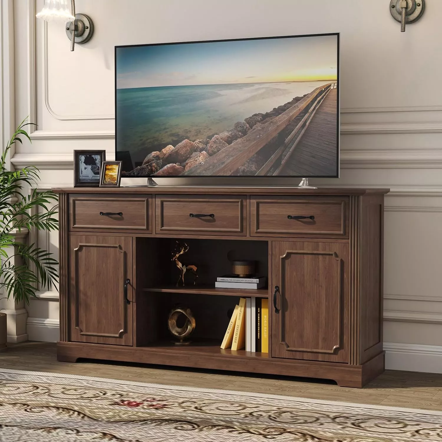 Bring charm, order, and functionality to your living space with this mid century modern TV stand designed for TVs up to 65 inches. Combining retro elegance with practical features, this entertainment center is a stylish focal point that keeps your space organized. The warm wood tones and vintage-inspired doors blend effortlessly with any décor, from minimalist to eclectic, making it a perfect addition to your home.