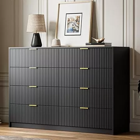 Designed with a modern minimalist edge, this black 8-drawer double dresser brings effortless style and practical storage to any room. Featuring a unique fluted drawer panel design, it adds texture and elegance while maintaining a clean, contemporary look. Whether you’re organizing your bedroom, sprucing up the living room, or maximizing entryway storage, this dresser is your go-to solution for both aesthetics and functionality.