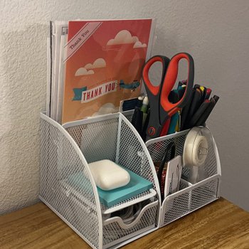 Crafted from durable metal mesh, it offers a modern look that complements any decor, from contemporary office setups to cozy home study corners. Scratch-resistant pads protect your surfaces while ensuring the organizer stays in place. With its open mesh design, everything inside stays visible and easily accessible, making it simple to grab what you need at a glance.