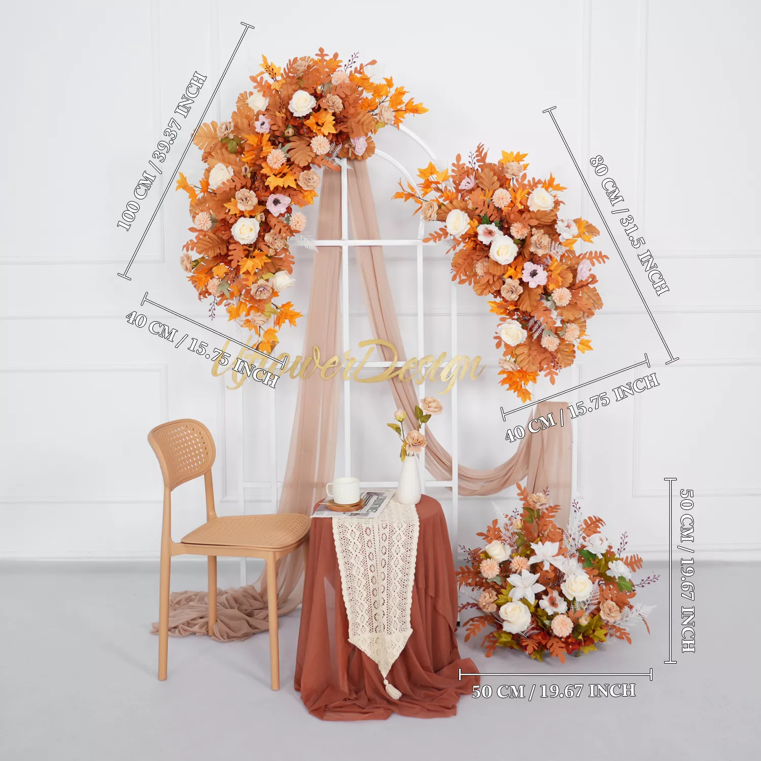 This floral arrangement shines brightest during weddings, seasonal celebrations, and outdoor exhibitions. Use it as a centerpiece for arches, windows, backdrops, or table runners to create a romantic, nature-inspired look. Its rich orange hues and maple accents make it especially fitting for autumn weddings and rustic-themed events.