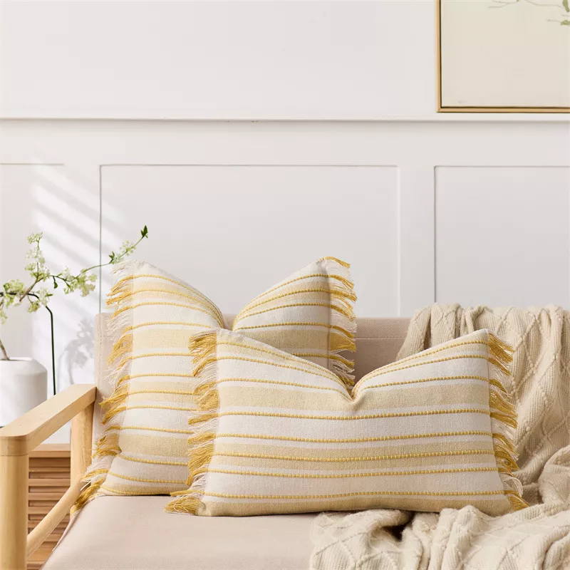 Refresh your space with the timeless charm of the Striped Jacquard Tassel Pillow Cover. Designed to blend comfort with effortless style, this cushion cover adds a touch of modern sophistication to any setting. Its beautifully yarn-dyed striped pattern and three-dimensional jacquard texture create a look that’s both cozy and chic—perfect for elevating your sofa, bed, or bay window nook.