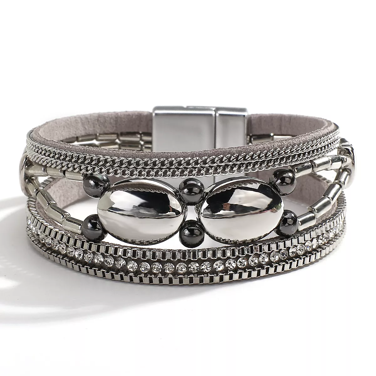Crafted with care, the bracelet features a comfortable leather band intertwined with delicate metal details and sparkling crystal accents. The geometric beads and multilayer wrap style give it a rich bohemian touch—perfect for expressing individuality and flair. Lightweight yet durable, it offers a comfortable fit that feels as good as it looks, whether you’re dressing up for a night out or keeping it casual at the office.