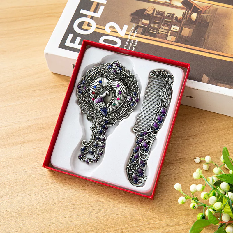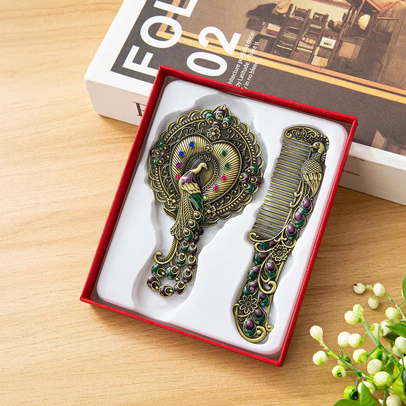 Vintage Peacock Mirror & Comb Gift Set – Elegant Metal Handheld Makeup Mirror with Handle